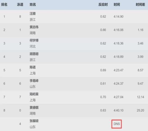 男子400米个人混合泳决赛成绩表。