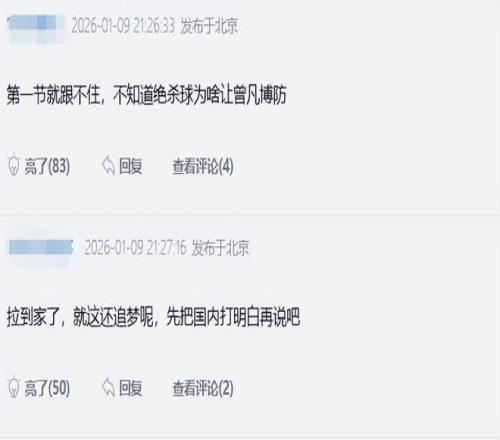 小曾在攻防两端的糟糕表现成了球迷们热议的焦点,有球迷形容小曾本场比赛的表现:没有任何一点防守,没有对抗,没有力量,没有横移,没有阅读。还有球迷直接嘲讽:拉到家了,就这还追梦呢,先把国内打明白再说吧。